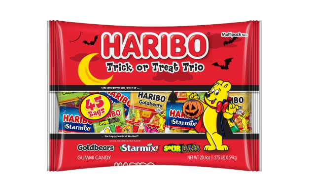 HARIBO Trick or Treat Trio Halloween Assorted Fruit Flavor and Shapes Gummy Candy, 20.4oz Bag, 45ct Mini Gummy Pouches