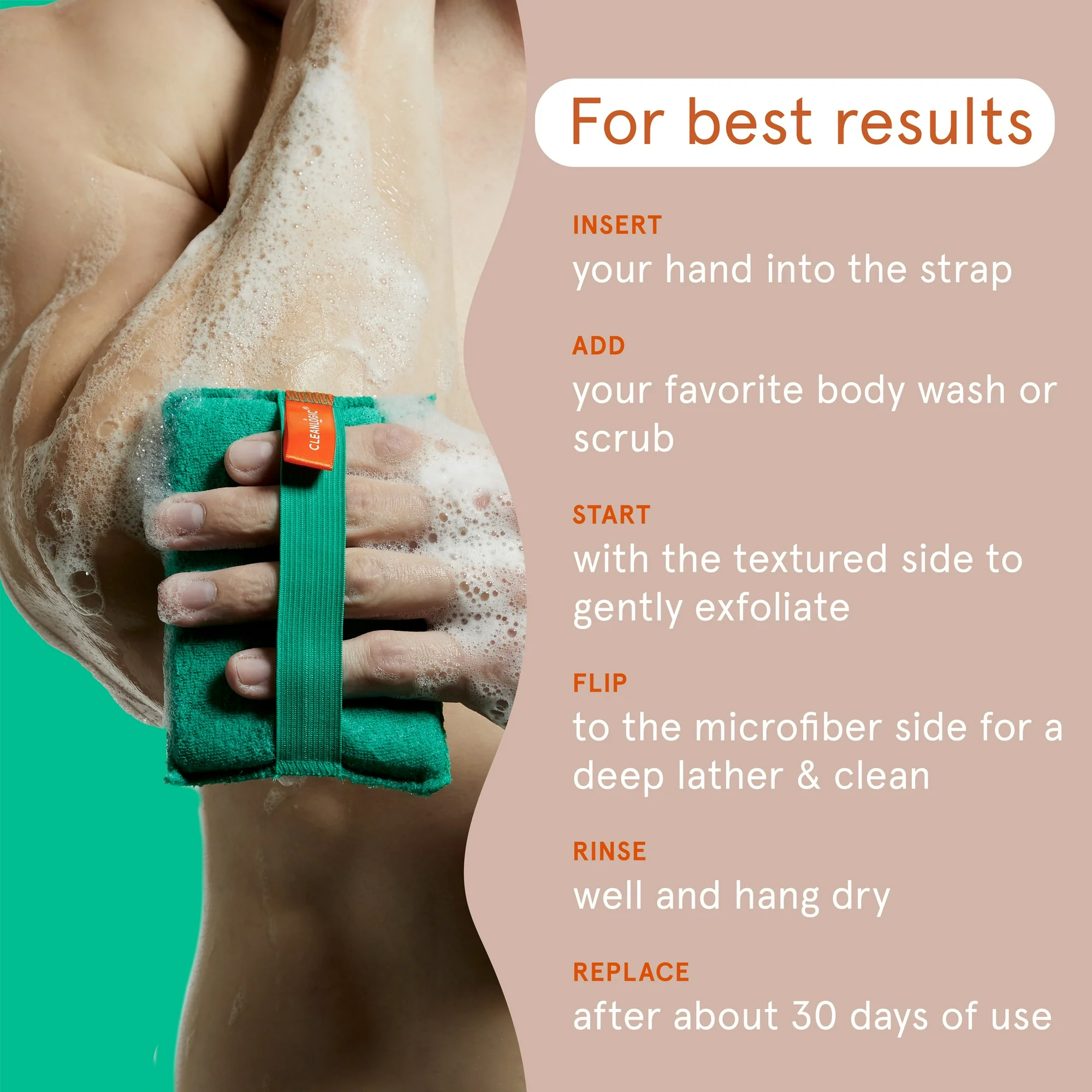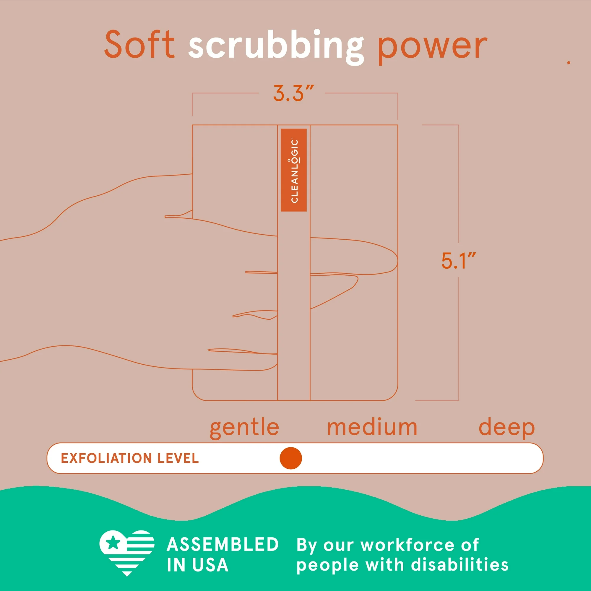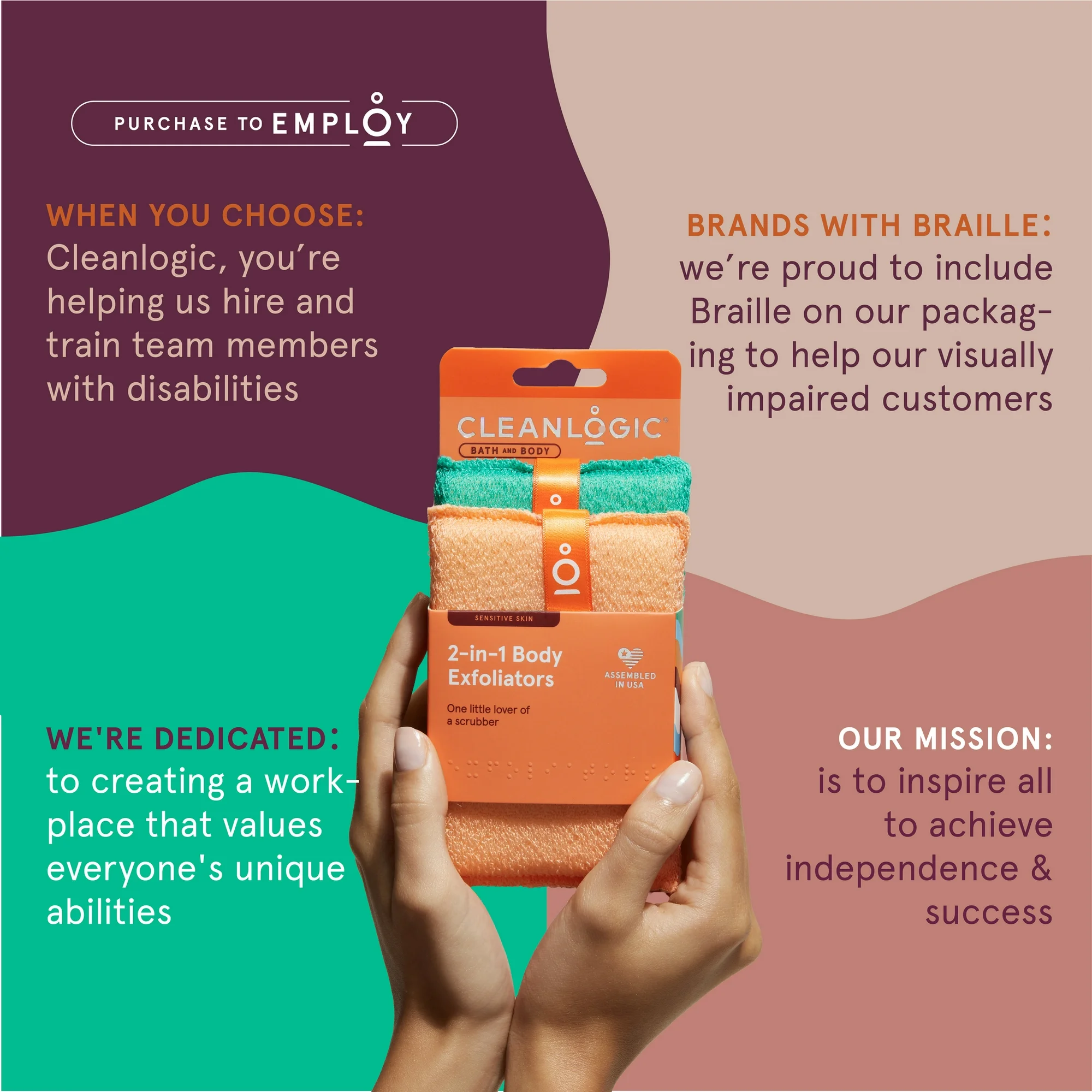 The Cleanlogic dual-texture body scrubber works to give your body a deep clean and gentle exfoliation. This loofah alternative is suitable for sensitive skin with a textured material for gentle exfoliation on one side and a soft terry cloth fiber on the second side for a generous lather & cleanse. Insert your hand into the ergonomic hand strap, lather with your favorite body wash, and scrub. Then rinse thoroughly and hang to dry with our handy, built-in hook. Treat your skin to a deep, immaculate clean every time with this exfoliating dead skin remover. This shower exfoliator helps remove dirt, oil & other impurities building up in your pores. Use this exfoliating body scrubber as part of your daily exfoliating skincare routine to help with common skin issues such as keratosis pilaris (aka chicken skin), acne, ingrown hairs, unwanted bumps & more. The best part? This product is proudly . When you choose a Cleanlogic premium bath product, you’re not just making a purchase – you’re making a difference. You’re helping us hire and train team members with disabilities. We also incorporate braille on our packaging, making every Cleanlogic product accessible to the visually impaired.