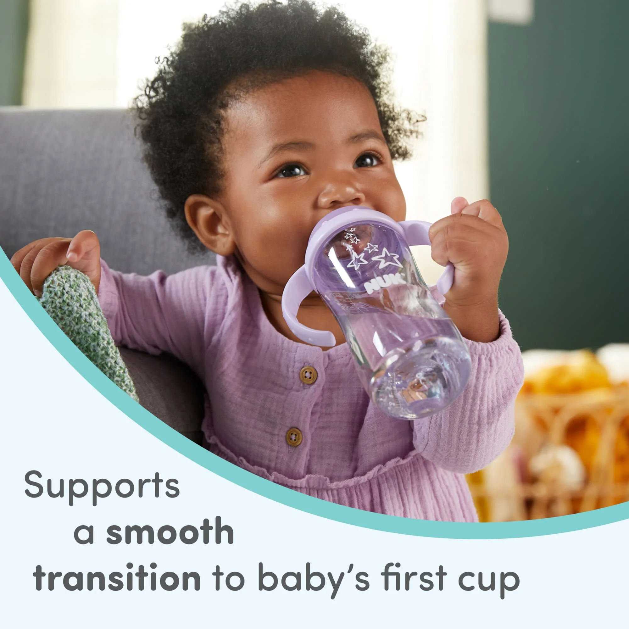 The NUK First Choice Learner Cup is designed to support a smooth and natural transition from bottle to baby’s first cup. With a gentle, spill-proof soft spout, it’s easy on developing teeth and gums while allowing liquids to flow comfortably as your little one sips. The built-in air vent helps reduce swallowed air, making feeding more comfortable. This 10 oz learner cup also features easy-to-grip, anti-slip handles that are perfectly sized for small hands and can be removed as your child grows. Made from BPA-free materials and safe for the dishwasher, the NUK Learner Cup is both convenient for parents and ideal for babies and toddlers 8 months and older.