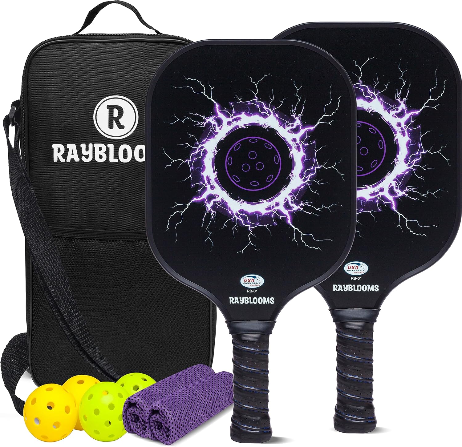 • 【Absorbing and Non-Slip Handle Grip】Rayblooms Pickle ball rackets 2 pack are equipped with an advanced grip technology that provides an exceptional hold, offering players enhanced control, stability, and comfort during gameplay. The specially designed grip reduces slippage and fatigue, allowing you to focus on your shots and perform at your best on the court