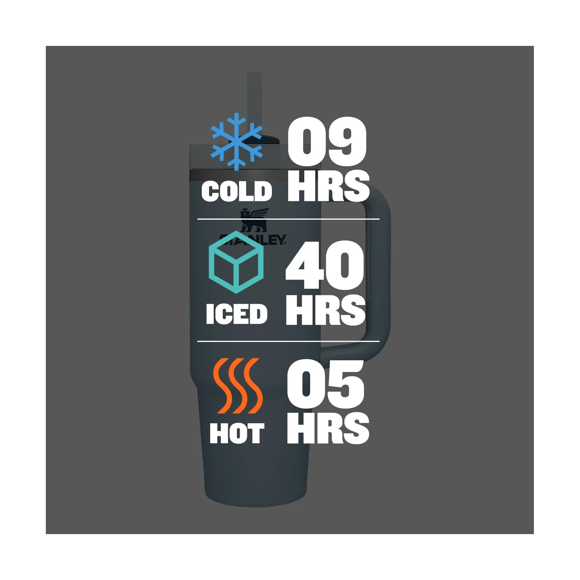 Double-wall vacuum insulation keeps drinks cold for 9 hours, hot for 5 hours, and iced for 40 hours